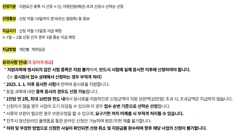 - 신청 방법: 온라인 신청 → 선정 후 개별 안내 → 시험 접수 후 정산 또는 영수증 제출
