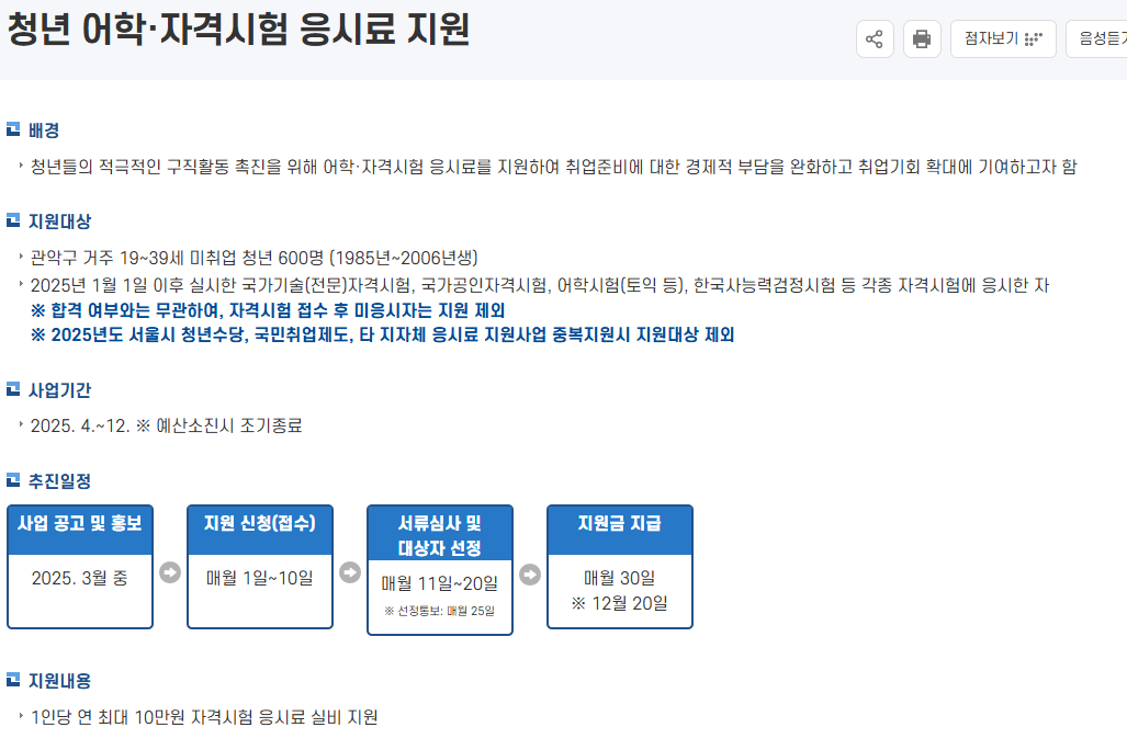 영어·중국어·일본어 자격증은 여전히 주요 취업 스펙 중 하나입니다. 하지만 응시료는 최소 5만 원에서 많게는 20만 원까지이며 반복 응시할 경우에는 더 부담이 커집니다. 소득이나 지역 차이로 인해 비용 부담이 시험 도전을 망설이게 만드는 현실, 특히 수도권 외 지역 청년들은 정보가 부족하거나 시험센터 접근성이 떨어지는 경우도 많아 지원의 필요성 커졌습니다. 이런 현실 속에서 지자체 기반의 응시료 지원은 청년의 기회 사다리 역할을 할 수 있습니다.